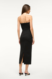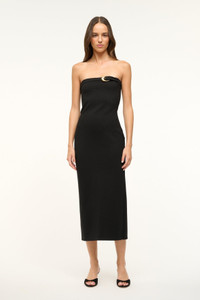 The Beekman is an ankle length strapless column dress with our signature moon buckle hardware at the neckline. MORE DETAILS - 68% Rayon, 27% Nylon,5% Spandex - Model is 5'10 and wearing a size S - Dry Clean Only
