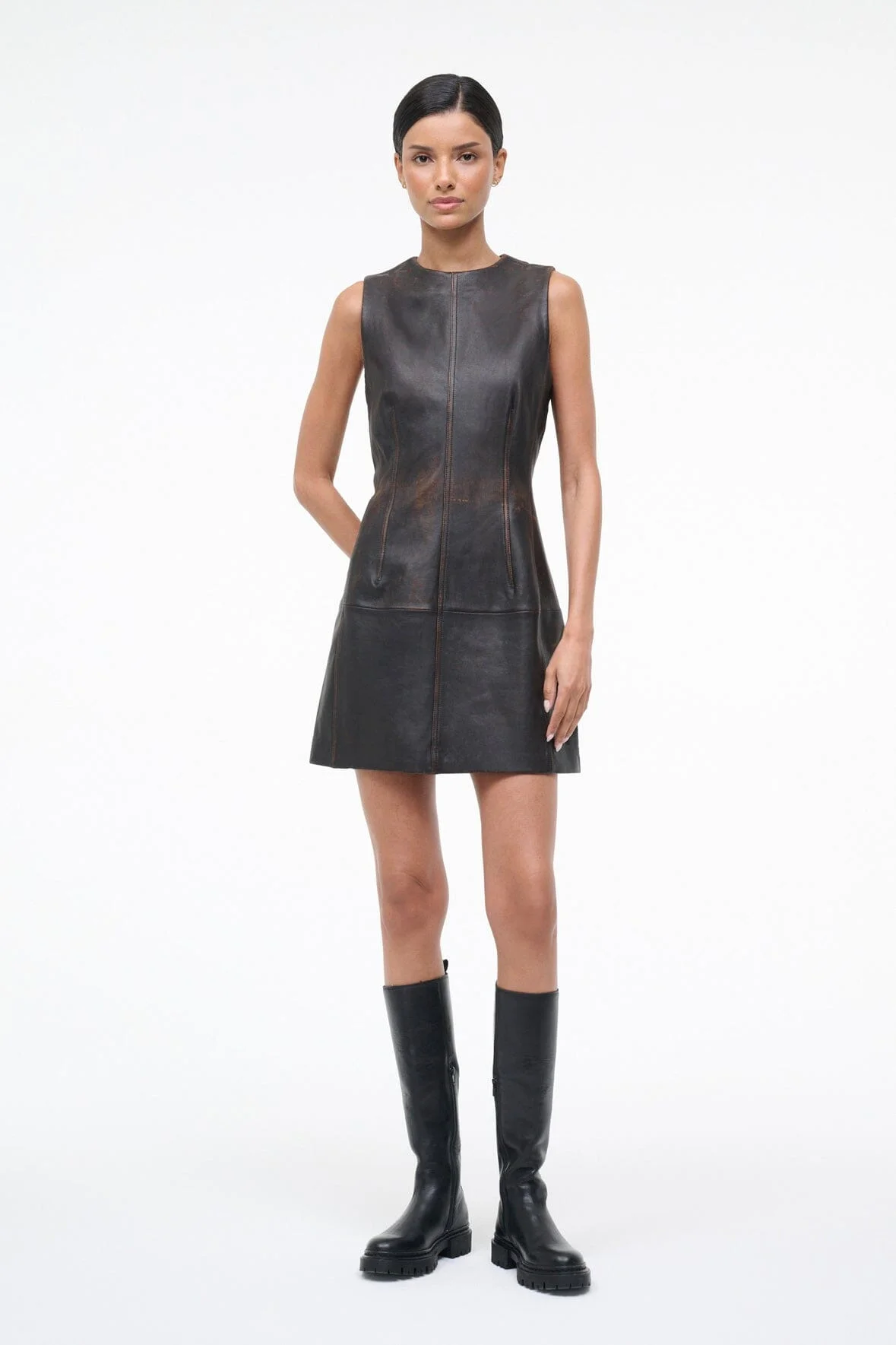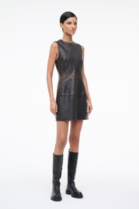 STAUD BINX LEATHER DRESS DISTRESSED BROWN