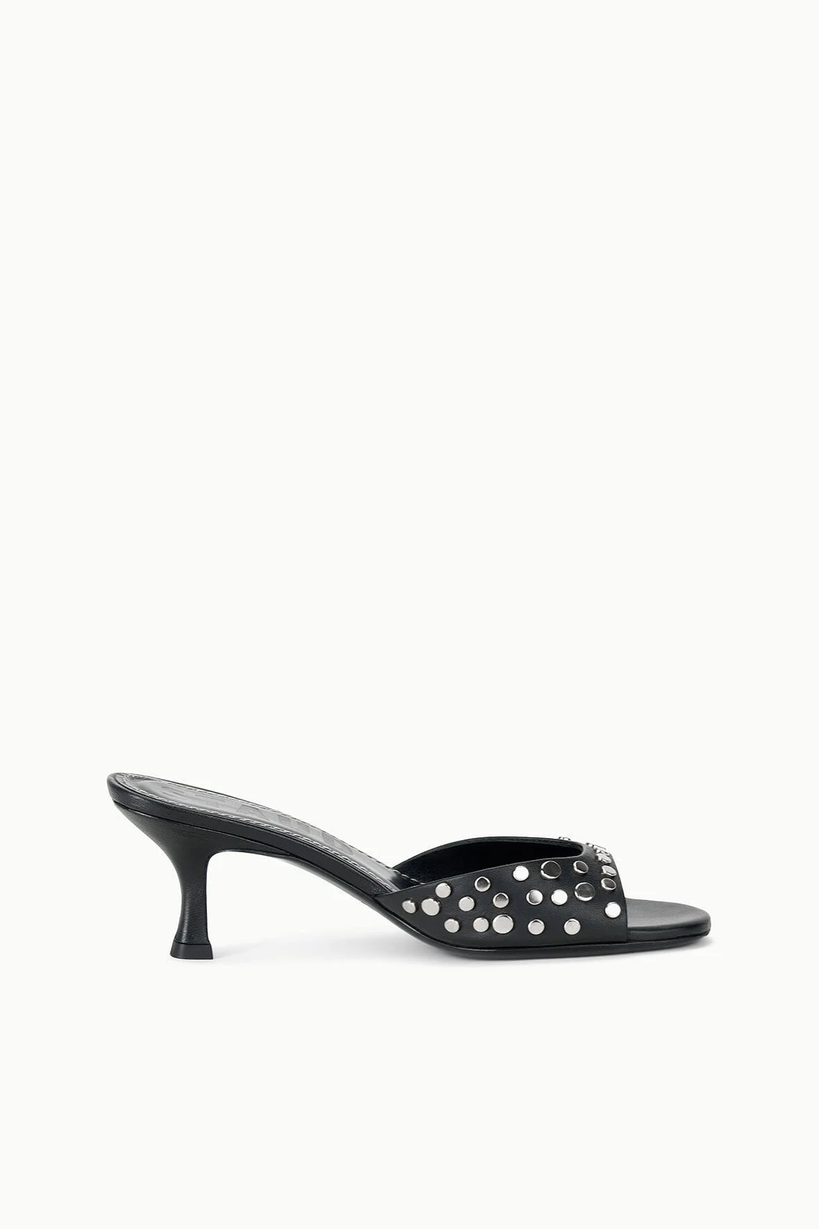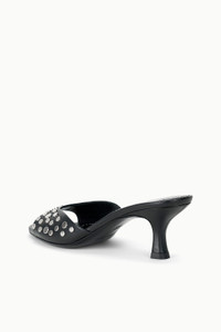 Our best-selling kitten heel, the Brigitte is an open toe mule crafted in nappa leather and updated with our seasonal metal rivets. MORE DETAILS - Leather Studded Kitten Heel - Upper: 90% Lamb Leather, 10% Brass, Sole: 90% Cow Leather, 10% Rubber
