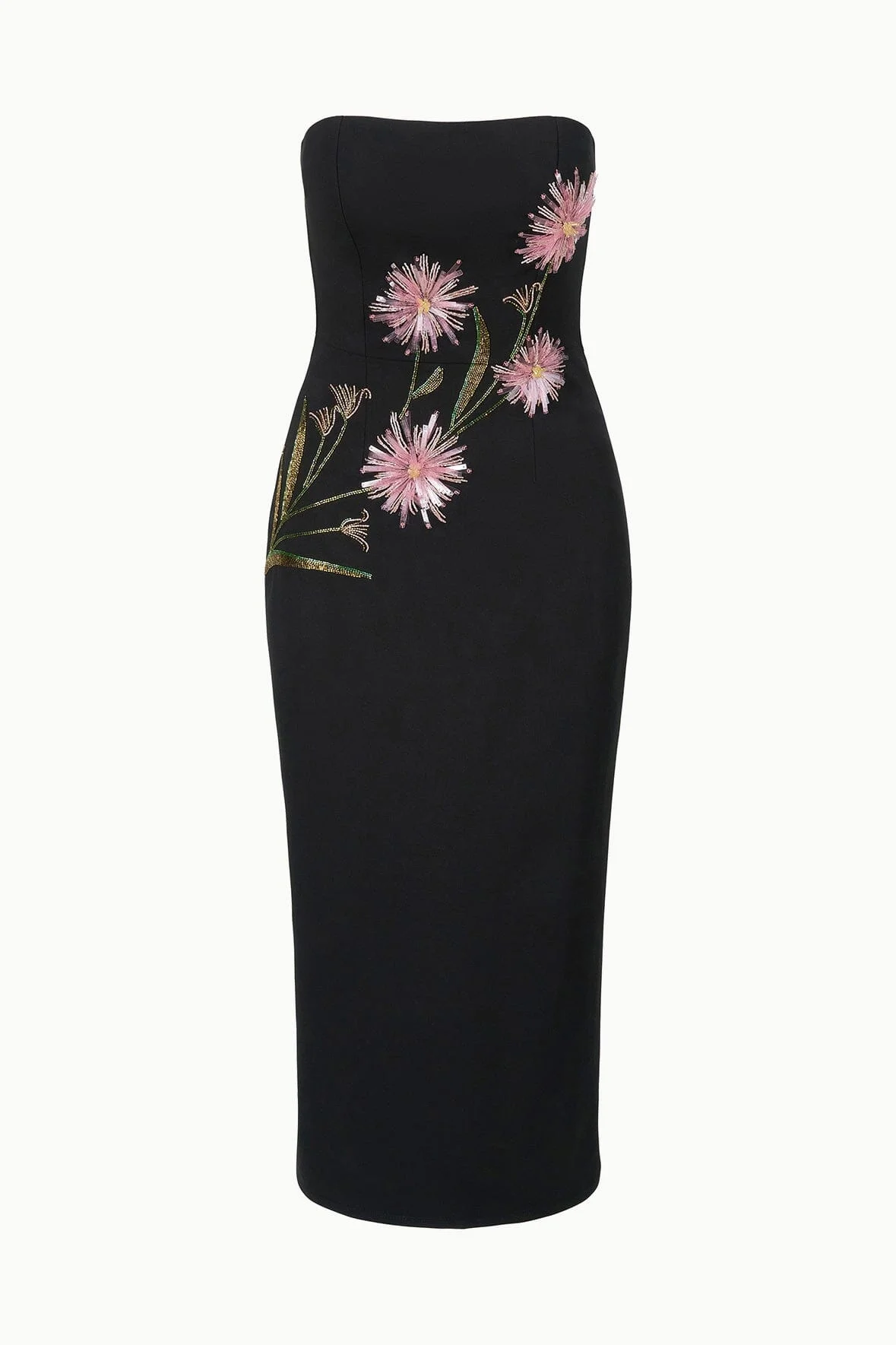 The Brooke is a strapless midi length dress with a hand-beaded floral detail across the bodice. MORE DETAILS - Self: 68% Viscose, 27% Nylon, 5% Elastane; Lining: 80% Nylon, 20% Elastane - Model is 5'10 and wearing a size S - Dry Clean Only