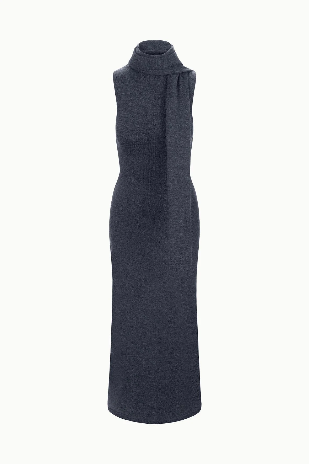 The Canal Midi Dress is a midi-length fitted sweater dress featuring a detachable scarf. This style features a roll neck turtleneck and a back seaming detail. MORE DETAILS - 100% Merino Wool - Model is 5'10 and wearing a size S - Dry Clean Only