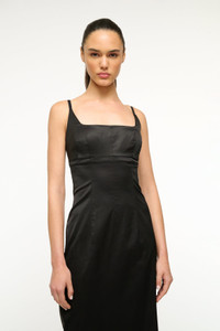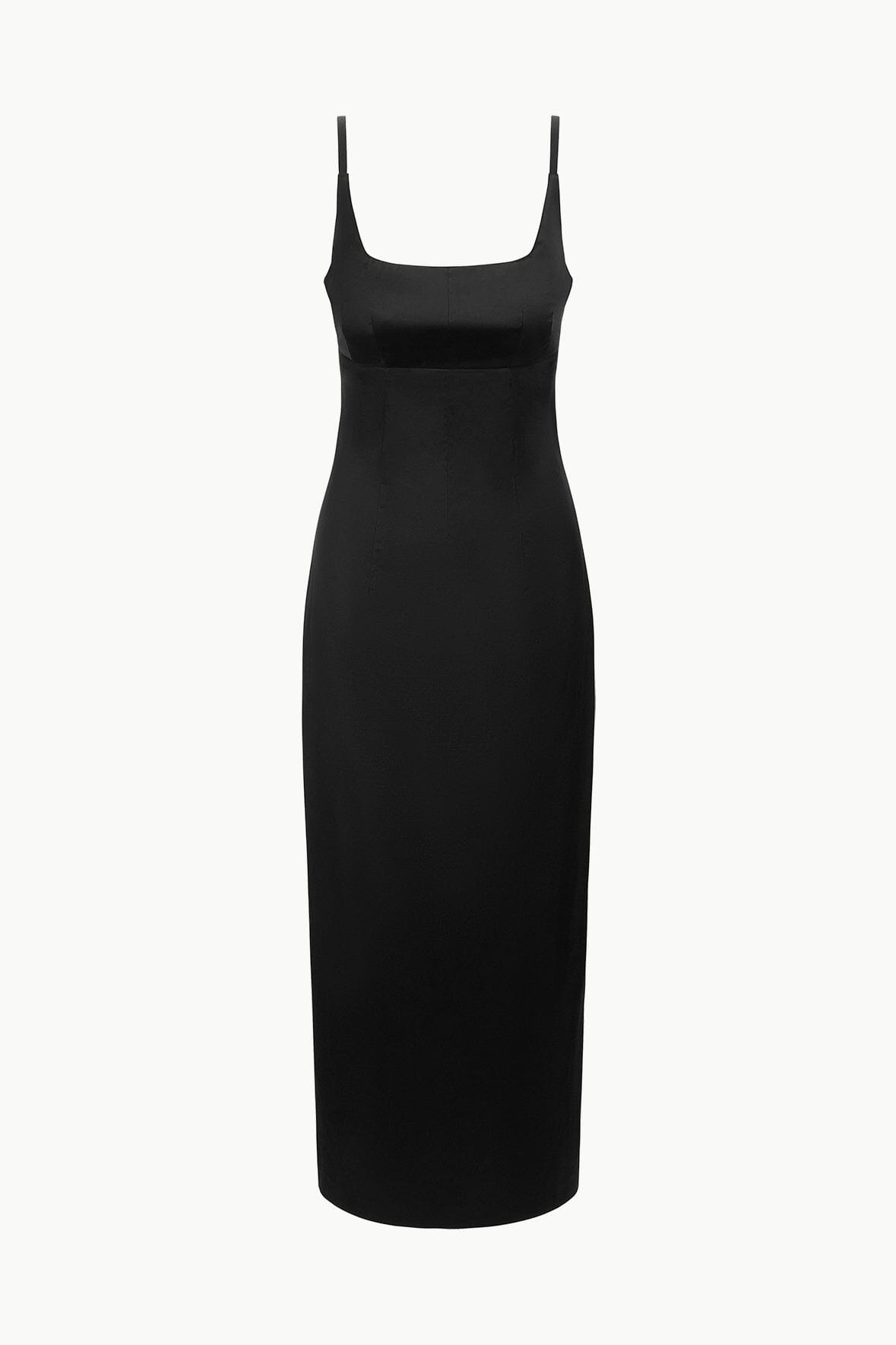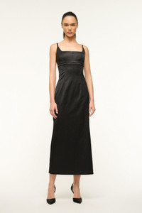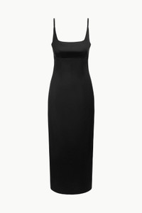 The Carol Dress is a stretch satin column dress with a square neckline and adjustable straps. The skirt features a center back slit and hits just above the ankle. MORE DETAILS - 60% Viscose, 37% Cotton, 3% Spandex - Model is 5'10 and wearing a size 4 - Dry Clean Only