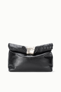 The Cuff Clutch is a slouchy clutch featuring our new organic draped metal cuff hardware. The clutch's interior is easily accessed through the zipper opening at the back and includes a detachable thin leather shoulder strap. MORE DETAILS - Leather Rolled Clutch with Cuff Hardware - 100% Cow Leather - Note: The roll-top and cuff hardware are decorative only