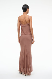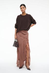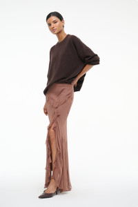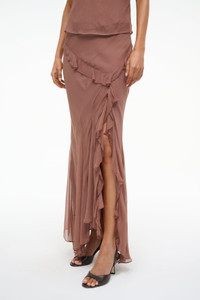 The Diana Skirt is a maxi skirt featuring a thigh high slit and flowy ruffle detailing. This style is crafted in our crinkle chiffon and can be paired with the Selena Top as a matching set. MORE DETAILS - Self: 100% Viscose, Lining: 100% Polyester - Model is 5'10 and wearing a size 4 - Dry Clean Only