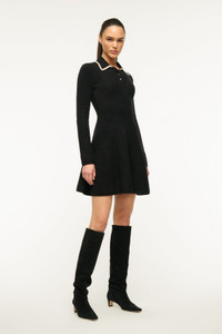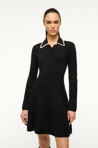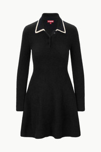 A cozy knit sweater dress fitted at the waist and full mini skirt. The Dujour features a polo collar and contrast tipping. MORE DETAILS - 55% Nylon, 32% Merino Wool, 10% Baby Alpaca, 3% Spandex - Model is 5'10 and wearing a size S - Dry Clean Only