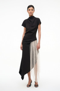 The Effie dress features a high, softly draped neckline and short sleeves. The bodice and skirt are gathered at the hip with a metallic enhanced tulle fabric with subtle draping and an asymmetrical hem. MORE DETAILS - Self: 70% Acetate, 30% Polyester, Core: 100% Polyester - Model is 5'10 and wearing a size 4 - Dry Clean Only