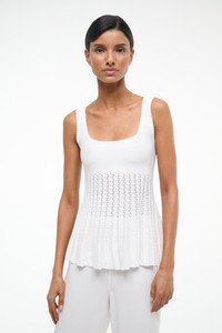 The Ellen top is a comfortable stretchy top in our pointelle compact knit, featuring bra-friendly straps and a flowy, pleated fit throughout the bodice. MORE DETAILS - 80% Viscose, 20% Nylon - Model is 5'10 and wearing a size S - Machine Wash Cold. Tumble Dry Low. Or Dry Clean.
