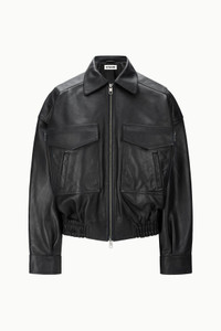 The Eugene Leather Jacket is a bomber style jacket crafted in supple calfskin leather. This style features a front zip and front pocket detailing. MORE DETAILS - Self: 100% Cow Leather, Lining: 100% Polyester - Model is 5'10 and wearing a size S - Dry Clean Only