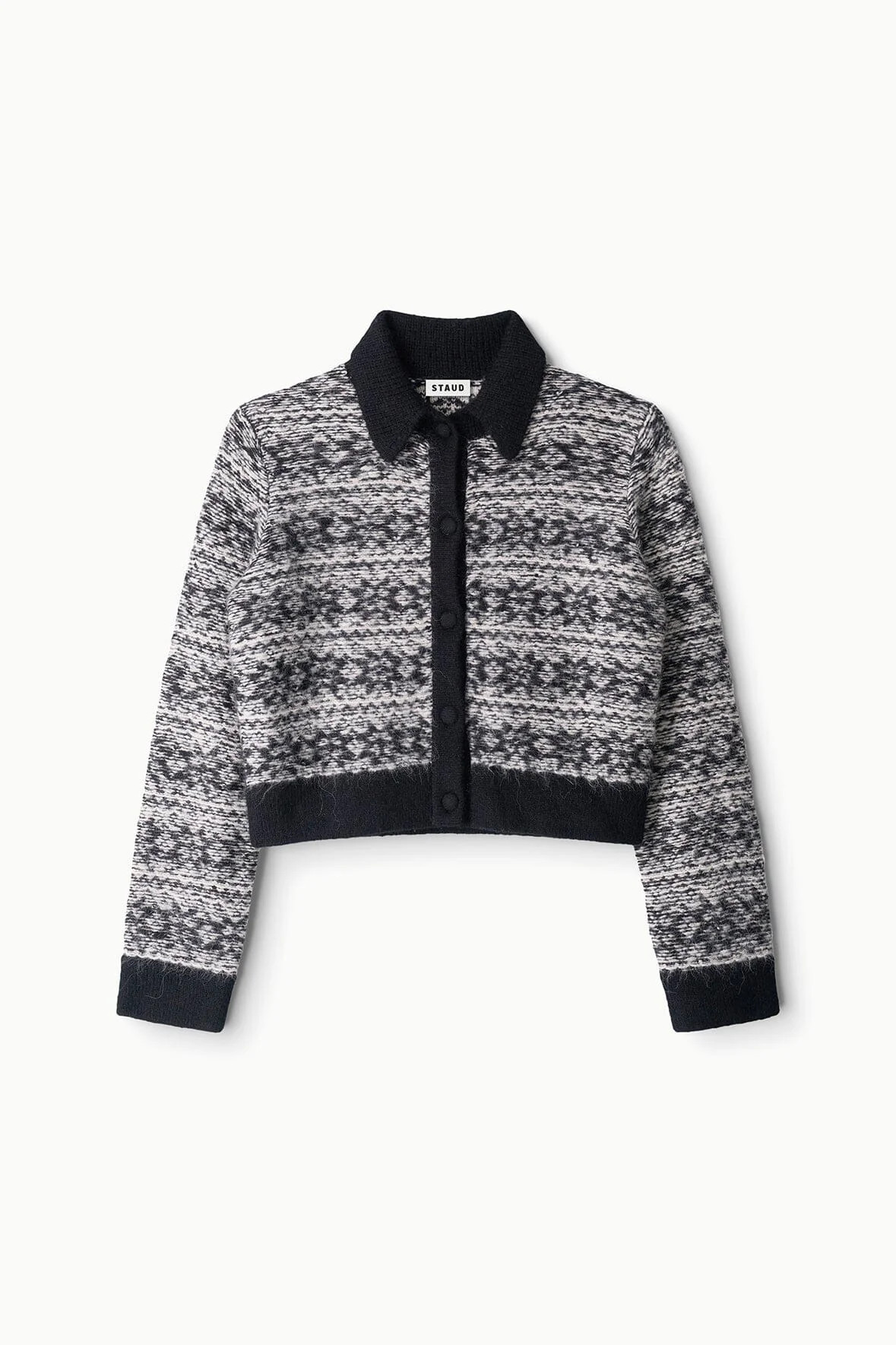 The Gerard is a wool blend button-front cardigan with an all-over fair isle print and contrasting collar, cuffs and button placket. MORE DETAILS - 47% Nylon, 28% Alpaca, 25% RWS Certified Wool - Model is 5'10 and wearing a size S - Dry Clean Only