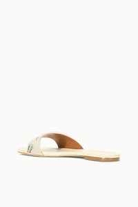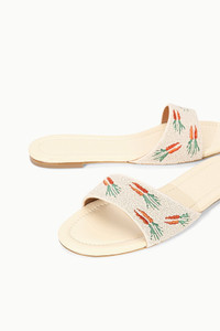 The Gracie Flat is a playful Summer slide featuring a seasonal carrot print. This style features a fully beaded and embroidered upper. MORE DETAILS - Beaded Leather Sandal - Upper: 90% Glass Beads, 10% Lamb Leather, Sole: 95% Cow Leather, 5% Rubber