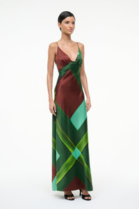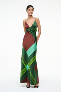 A maxi dress crafted in silk satin, the Hank features classic slip dress details in a v-neckline and spaghetti straps. MORE DETAILS - Self: 93% Silk, 7% Spandex, Lining: 95% Polyester, 5% Spandex - Model is 5'10 and wearing a size S - Dry Clean Only