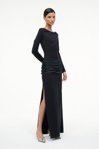 The Holland Dress is a long sleeve boat neck dress with a ponte body and a contrast taffeta draped waist detail.