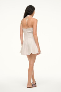 The Leone Linen Dress is a halter tie mini dress made in stretch linen. This style has a fitted waist and a-line skirt. MORE DETAILS - 53% Linen, 45% Viscose, 2% Spandex - Model is 5'10 and wearing a size 4 - Dry Clean Only