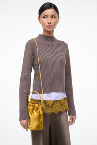 The Lila is a handheld satin evening bag with a drawstring closure. It features a detachable leather shoulder strap. MORE DETAILS - Satin Bucket Bag - Self: 100% Polyester, Trim: 100% Cow Leather