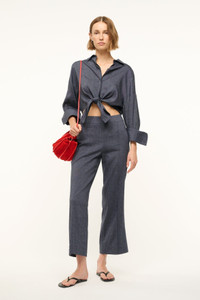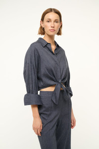 The Lisa Top is a cropped button down shirt with a center front tie and elasticated waistband. This styles features fixed 3/4 length sleeves for ease. MORE DETAILS - 53% Linen, 45% Nylon - Model is 5'10 and wearing a size S - Dry Clean Only