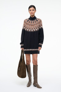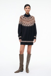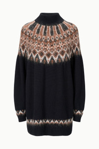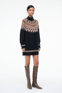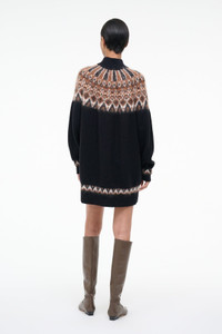 A cozy wool blend turtleneck dress, the Liza features a fairisle jacquard pattern and slightly boxy fit. MORE DETAILS - Yarn Blend 1: 60% Wool, 40% Nylon, Yarn Blend 2: 36% Nylon, 30% Mohair, 27% Acrylic, 7% Wool - Model is 5'10 and wearing a size S - Dry Clean Only