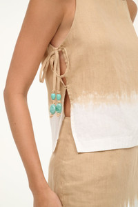 The Mancora Linen Top is a square neckline sleeveless top with a dip dye pattern. This style features side ties with turquoise beads and side slits for breezy resort wear. MORE DETAILS - 100% Linen - Model is 5'10 and wearing a size S - Dry Clean Only