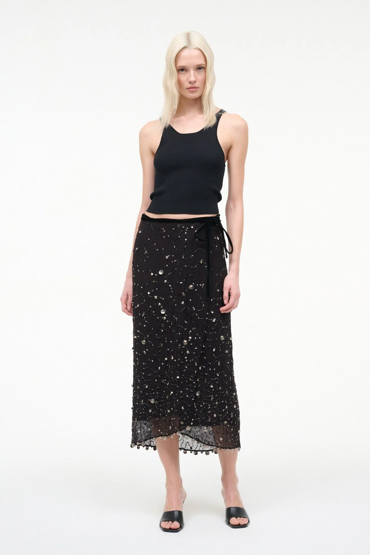The Mer is a sheer wrap skirt with all-over beading and delicate accent charms. It features a tie closure for an adjustable, flattering fit. Perfect as a beach coverup or layered piece for effortless coastal style. MORE DETAILS - Face: 50% Brass, 50% Glass Beads, Self: 100% Viscose, Lining: 100% Nylon - Model is 5'10 and wearing a size XS/S - Dry Clean Only