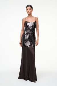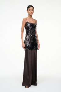 The Mesa Dress is a new gown silhouette, featuring a sequined bodice with large square paillettes and a satin skirt. MORE DETAILS - Self: 100% Polyester, Lining: 88% Polyamide, 12% Spandex, Corset: 93% Silk, 7% Spandex - Model is 5'10 and wearing a size 4 - Dry Clean Only