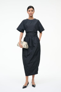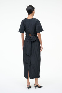 An architectural short-sleeve dress crafted in taffeta, the Michelina is the perfect versatile dress for any festive occasion. This style features a tulip skirt and gathering deatil at the waist with bow tie in the back. MORE DETAILS - 100% Polyester - Model is 5'10 and wearing a size S - Dry Clean Only