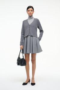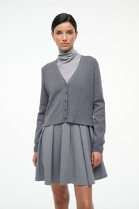 The Milo Dress is a mixed media mini dress, with a woven tonal skirt and a full-fashioned long sleeve cardigan in our cotton cashmere. MORE DETAILS - Top: 95% Cotton, 5% Cashmere, Skirt: 49% Polyester, 36% Rayon, 8% Wool, 7% Spandex - Model is 5'10 and wearing a size S - Dry Clean Only