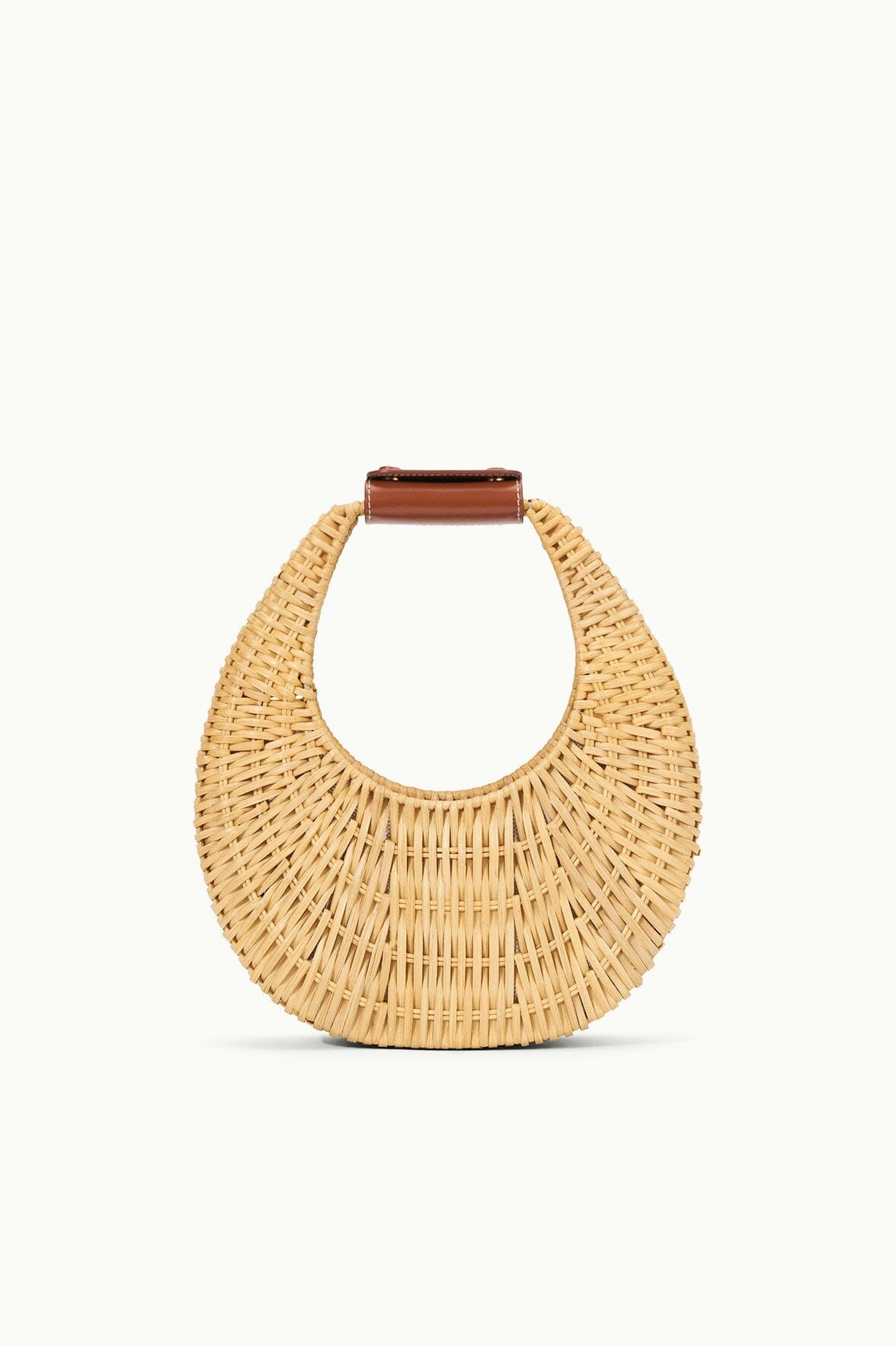 The Mini Moon Wicker Bag is an update to our classic crescent moon shape in natural wicker with inner suede lining, a leather handle, and a magnetic closure to hold your essentials. This bag comes with a removable crossbody strap. MORE DETAILS - Crescent Shaped Mini Moon with Crossbody Strap - Self: 100% Natural Wicker, Trim: 100% Cow Leather - 9" W x 10.8" H x 3" D x 5.2" Handle Drop x 3.5" Strap Drop
