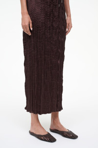 The Mizu is a plisse midi length column dress with a removable waist tie. It can be layered over the Nami Pant for a coordinated set or dressed up with a heel for a night out. MORE DETAILS - Self: 100% Polyester, Lining: 97% Polyester, 3% Elastane - Model is 5'10 and wearing a size S - Dry Clean Only