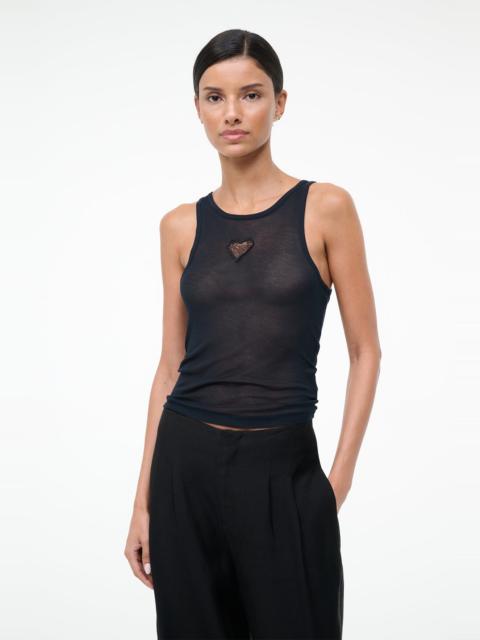Lightweight sheer rib knit tank in black featuring a distinctive heart cutout at the center front. The delicate fabrication and unique design detail make this piece a versatile layering essential with modern edge. MORE DETAILS - 100% Modal - Model is 5'10 and wearing a size S - Dry Clean Only