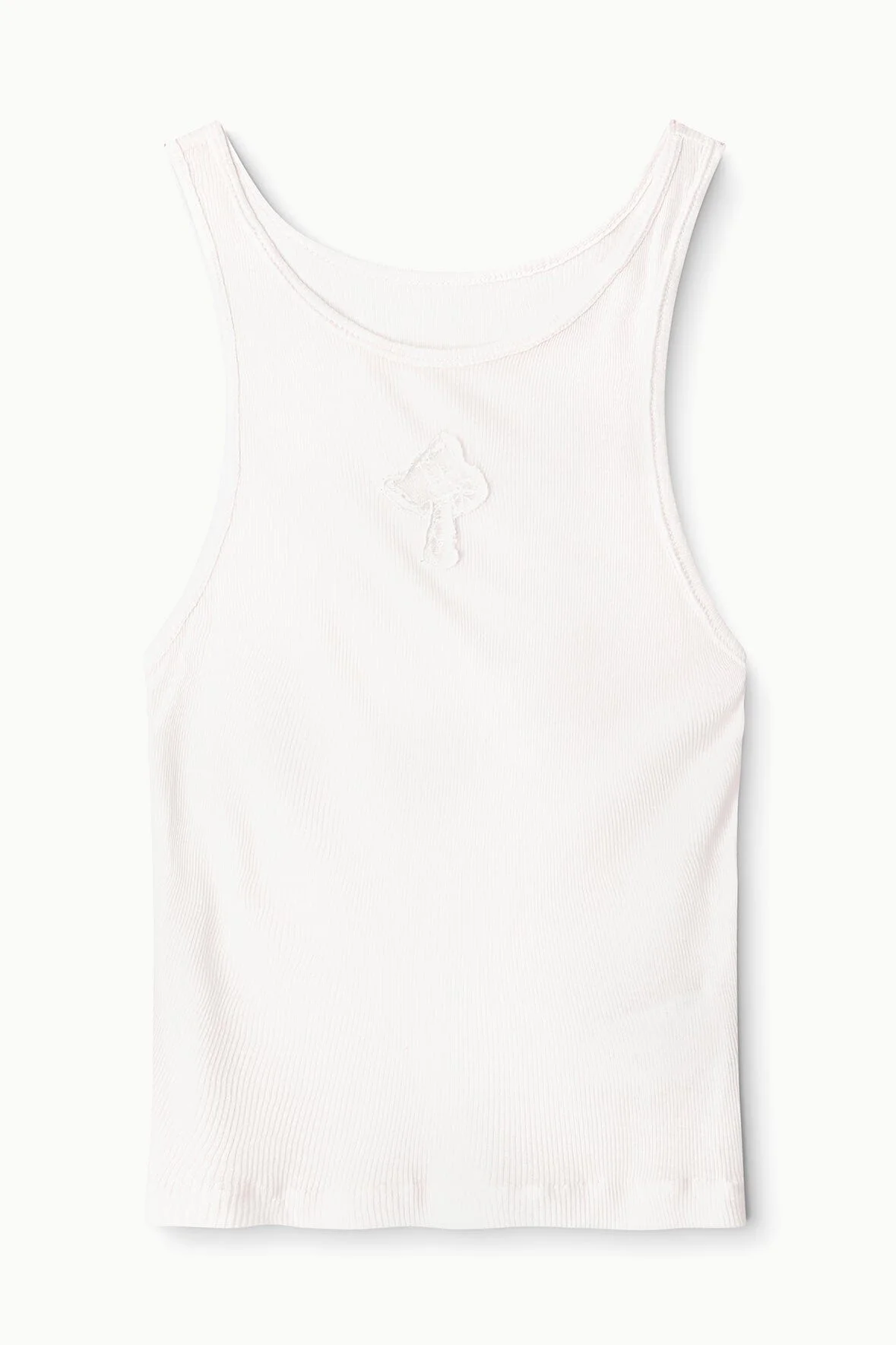 Lightweight sheer rib knit tank in black featuring a distinctive mushroom cutout at the center front. The delicate fabrication and unique design detail make this piece a versatile layering essential with modern edge. MORE DETAILS - 100% Modal - Model is 5'10 and wearing a size S - Dry Clean Only