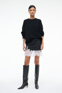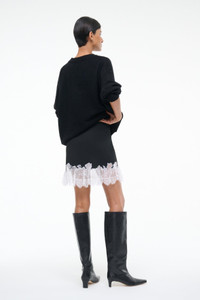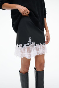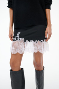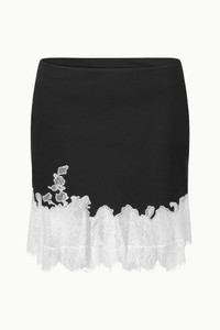 The Nadia Mini Skirt is a fitted mini with contrast cut-out lace detailing at the hem. This style features a hidden zipper. MORE DETAILS - Self: 49% Polyester, 36% Viscose, 8% Wool, 7% Elastane, Lining:100% Polyester - Model is 5'10 and wearing a size S - Dry Clean Only
