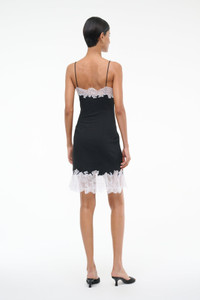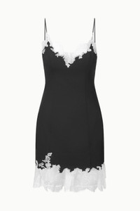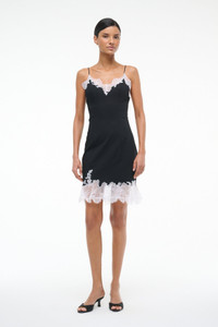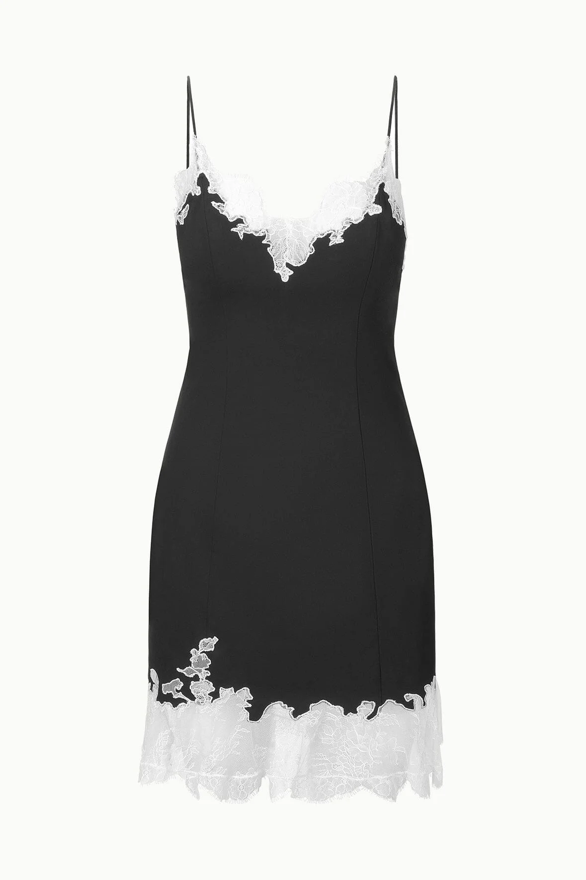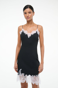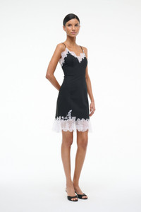 The Nadia Mini Dress is a fitted silhouette with contrast lace detailing at the neckline and hem. This style features princess seaming and thin spaghetti straps. MORE DETAILS - Self: 49% Polyester, 36% Viscose, 8% Wool, 7% Elastane, Lining:100% Polyester - Model is 5'10 and wearing a size S - Dry Clean Only