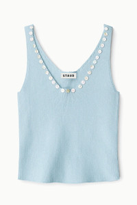 The Neva Tank is a merino wool and cotton blend tank with decorative button detailing along the neckline. MORE DETAILS - 50% Wool, 50% Cotton - Model is 5'10 and wearing a size S - Dry Clean Only
