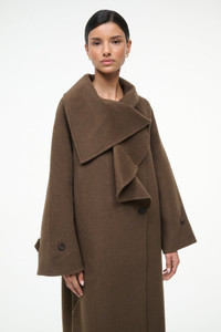 The Noah Coat is a beautiful long wool coat featuring an asymmetrical draped lapel. MORE DETAILS - 70% Wool, 30% Acrylic blend - Model is 5'10 and wearing a size S - Dry Clean Only