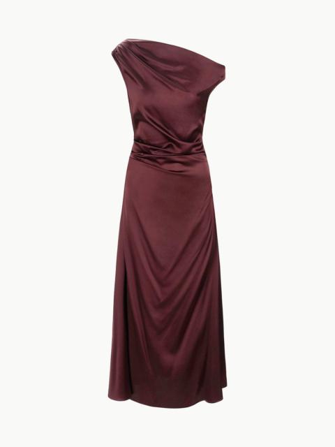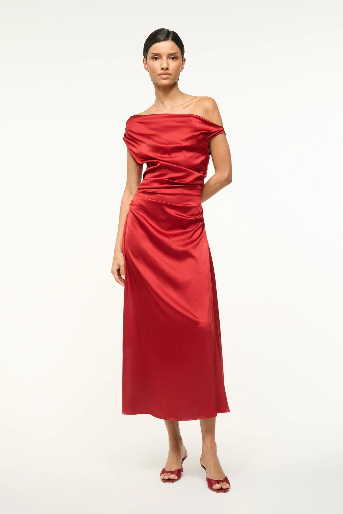 The Phare Dress features a draped off-the-shoulder neckline, a fitted waist and an ankle-grazing length. Updated in our stretch silk, this dress is perfect for a special occasion. MORE DETAILS - 93% Silk, 7% Spandex - Model is 5'10 and wearing a size 2 - Dry Clean Only