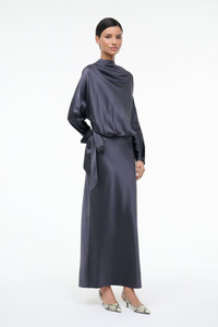 The Phoebe is a dolman sleeved dress crafted from a stretch silk satin fabric and features a side tie detail at the waist with a maxi-length column skirt. MORE DETAILS - 93% Silk, 7% Spandex - Model is 5'10 and wearing a size 4 - Dry Clean Only