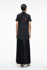 The Pia Dress is a new tent maxi dress crafted in grosgrain, with a sheer chiffon skirt. This style features short sleeves, an open back, and a tie at the neck.