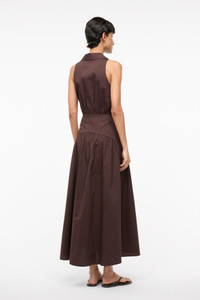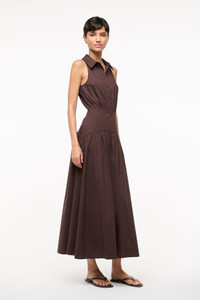 The Romy Dress is a sleeveless update to our best-selling Rocco Dress; featuring a classic collar and front button detail, this style has slight ruching at the waist and a curved yoke detail at the hip. MORE DETAILS - 98% Cotton, 2% Spandex, Lining: 100% Cotton - Model is 5'10 and wearing a size 4 - Dry Clean Only