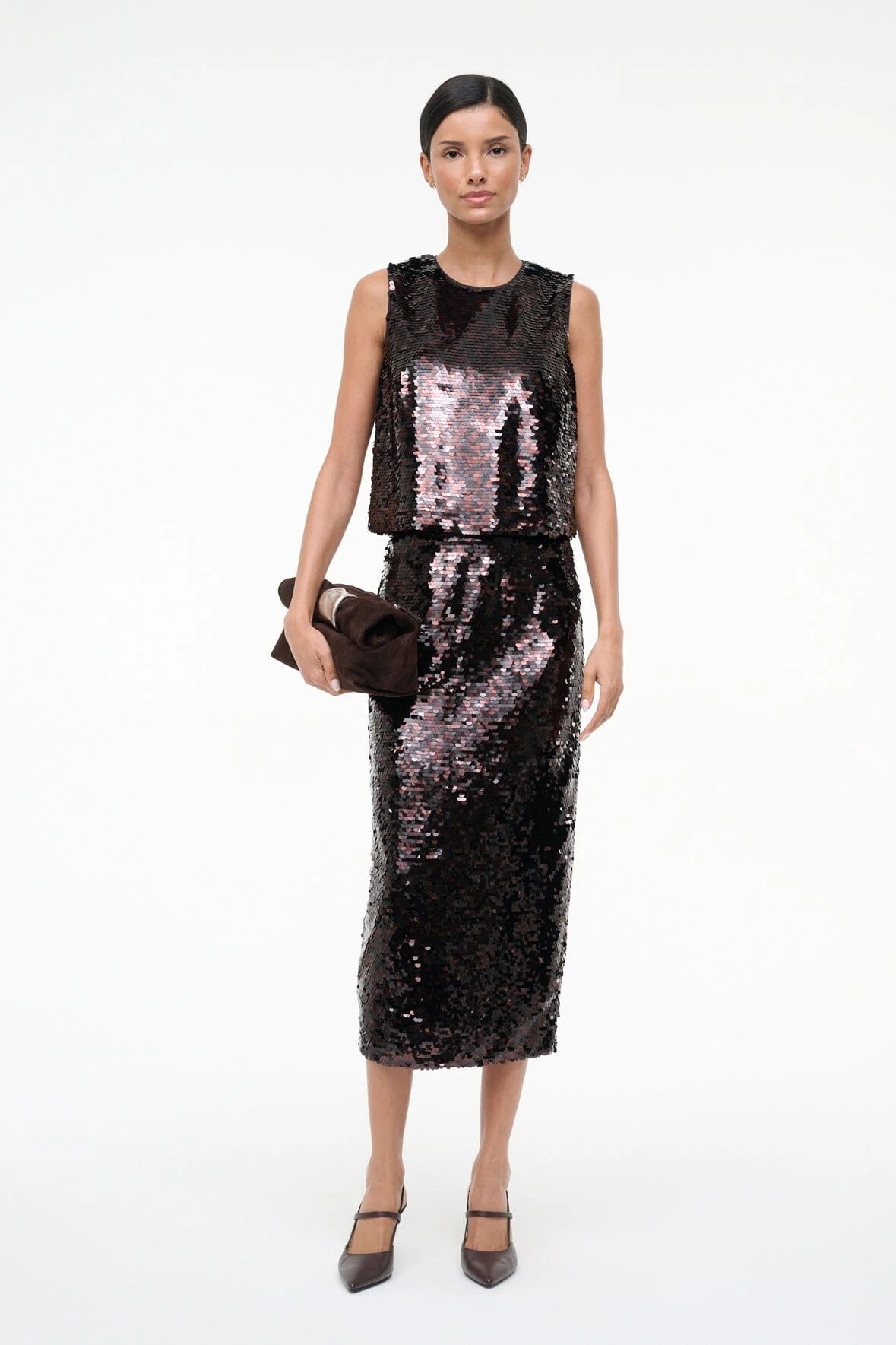 A slightly cropped tank perfect for any festive occasion. The Seraphina Top is constructed with two-tone sequins and features a boxy silhouette. Dress down with denim or wear as a matching set with the Ciara Skirt. MORE DETAILS - 100% Polyester - Model is 5'10 and wearing a size 4 - Dry Clean Only