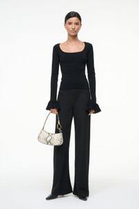 The Shelley Top is a fitted knit top featuring a deep scoop neckline and flared crochet sleeve cuffs. MORE DETAILS - 83% Recycled Viscose, 17% Polyester - Model is 5'10 and wearing a size S - Dry Clean Only