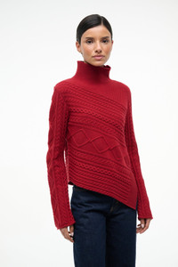 A cable knit turtleneck sweater made from a wool blend. The Sidney features an asymmetrical hem and diagonal knit pattern. MORE DETAILS - 51% Wool, 49% Nylon - Model is 5'10 and wearing a size S - Dry Clean Only