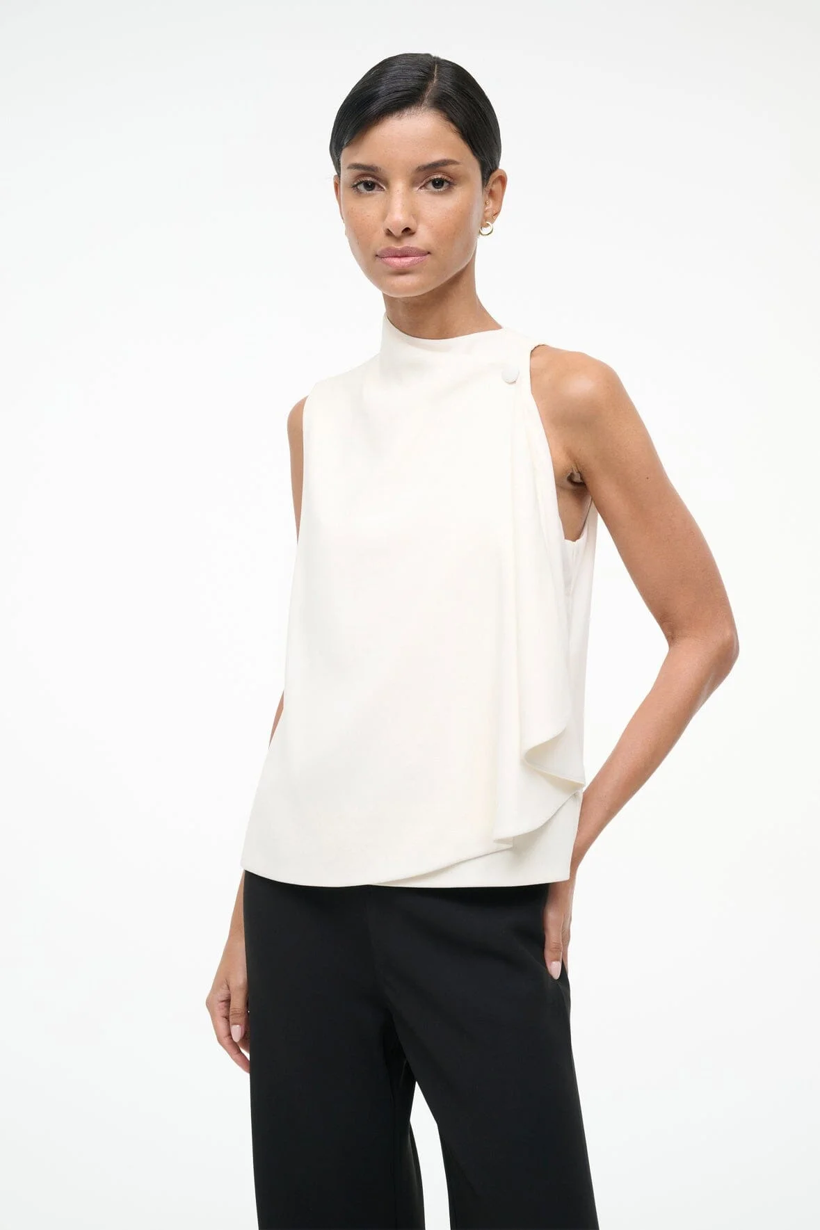 The Sierra Top is a draped asymmetrical sleeveless top featuring draped detailing throughout the body and a single button at the neck. MORE DETAILS - Self: 70% Acetate 30% Polyester, Core: 93% Silk, 7% Spandex - Model is 5'10 and wearing a size 4 - Dry Clean Only