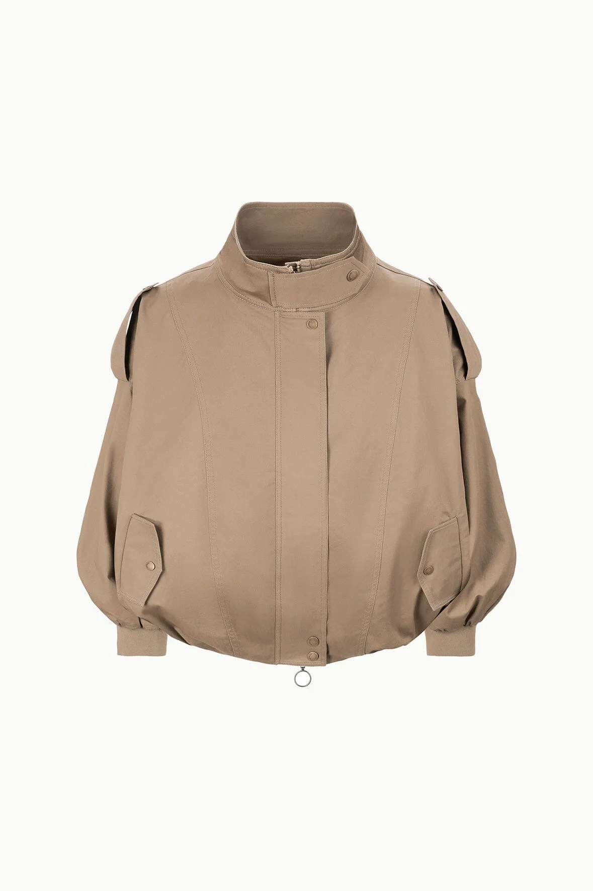 The Simone Jacket is an oversized bomber jacket featuring a front zipper and hidden snap closures. This style is crafted in a soft chino fabric. MORE DETAILS - Self: 98% Cotton, 2% Spandex, Lining: 100% Polyester - Model is 5'10 and wearing a size S - Dry Clean Only