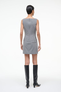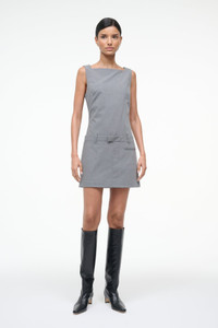 The Skyla is a mini shift dress with a boat neckline and drop waist detailing with belt loops. MORE DETAILS - Self: 62% Polyester, 26% Viscose, 6% Wool, 6% Spandex, Lining: 95% Polyester 5% Elastane - Model is 5'10 and wearing a size S - Dry Clean Only