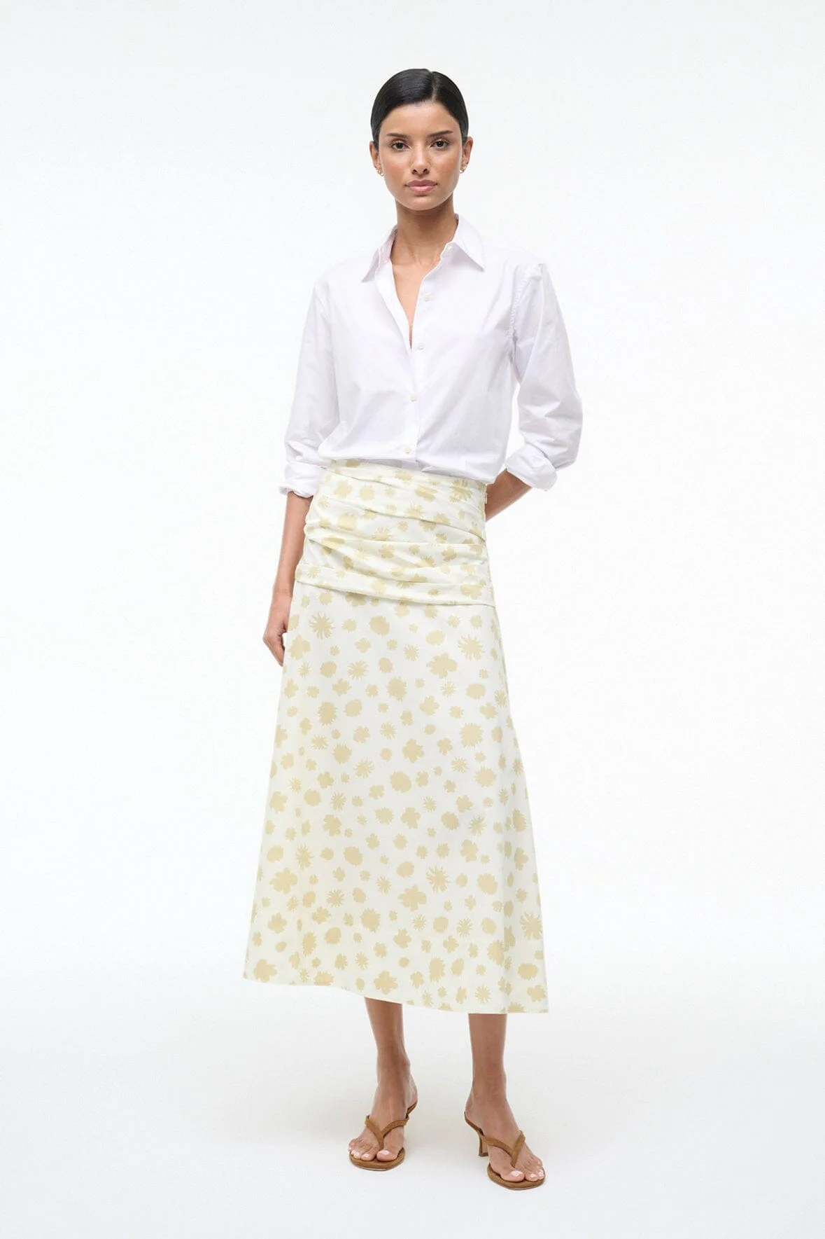 The Sol Skirt features an A-line silhouette with flattering mid-rise fit and subtle ruching details. Crafted from crisp poplin for a polished, structured look that moves with you. This style can be paired with the Lorenzo top for a matching set. MORE DETAILS - Self: 98% Cotton, 2% Spandex, Lining: 100% Cotton - Model is 5'10 and wearing a size 4 - Dry Clean Only