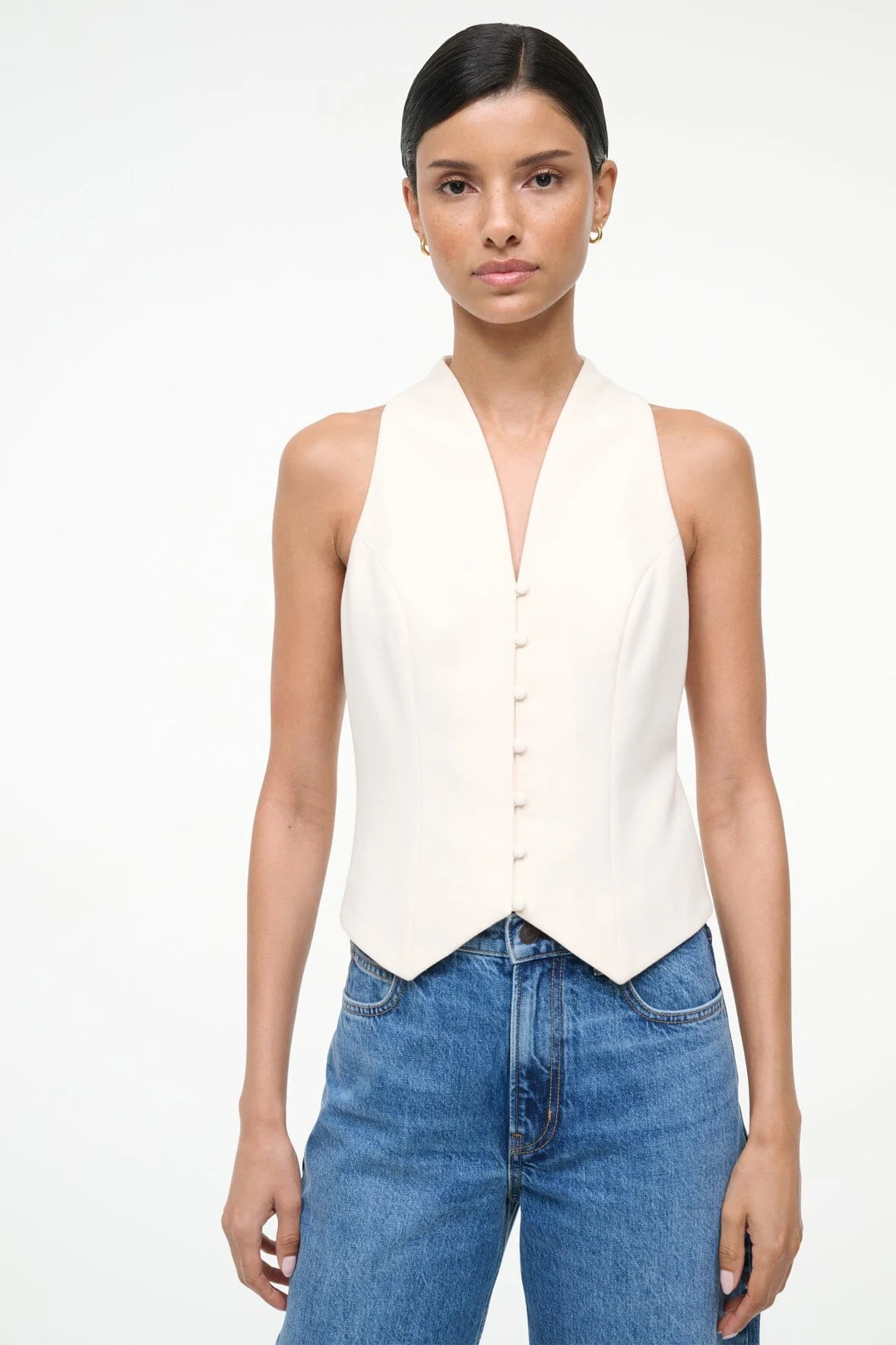 The Stella Top is a fitted button up vest with a curved v-neckline. This style features a cutaway detail at the waist. MORE DETAILS - Self: 68% Polyester, 27% Viscose, 5% Elastane, Lining: 97% Polyester, 3% Elastane - Model is 5'10 and wearing a size 4 - Dry Clean Only