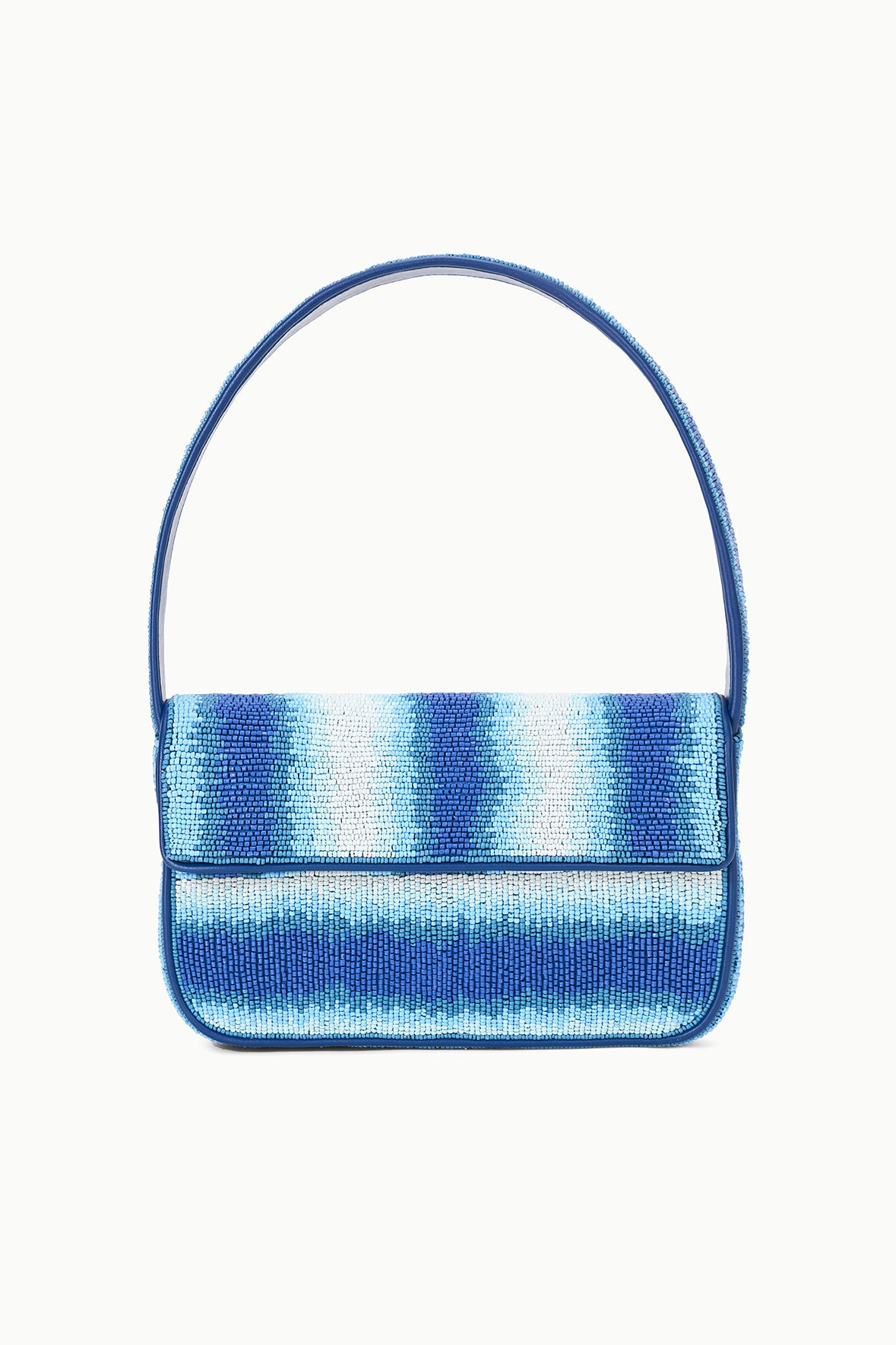 Our best-selling, hand-beaded shoulder bag featuring a gradient stripe pattern. The Tommy features vegan leather piping, a back slip pocket, magnetic snap closure, and interior satin lining. MORE DETAILS - Beaded Vegan Leather Shoulder Bag - Upper: 100% Glass Beads; Base: 100% Rayon; Trim: 100% Polyurethane