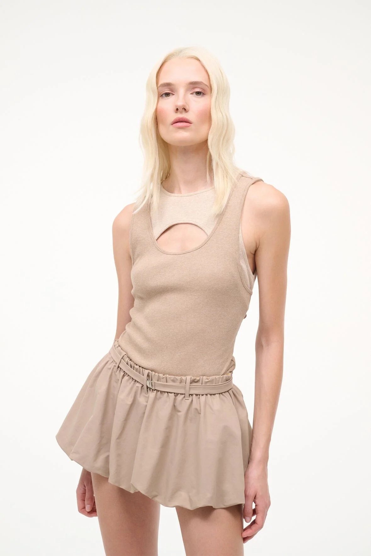 A sporty two-tone layered rib knit tank with a sleek neckline opening. The connected design delivers a modern silhouette perfect for active wear and everyday styling. MORE DETAILS - 94% Cotton, 6% Spandex - Model is 5'10 and wearing a size S - Dry Clean Only
