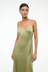 The Trinity is a maxi length slip dress with lace inserts down the front and back of the skirt. It features a v-neckline, low back and spaghetti straps. MORE DETAILS - Self: 93% Silk, 7% Elastane - Model is 5'9 and wearing a size 4 - Dry Clean Only
