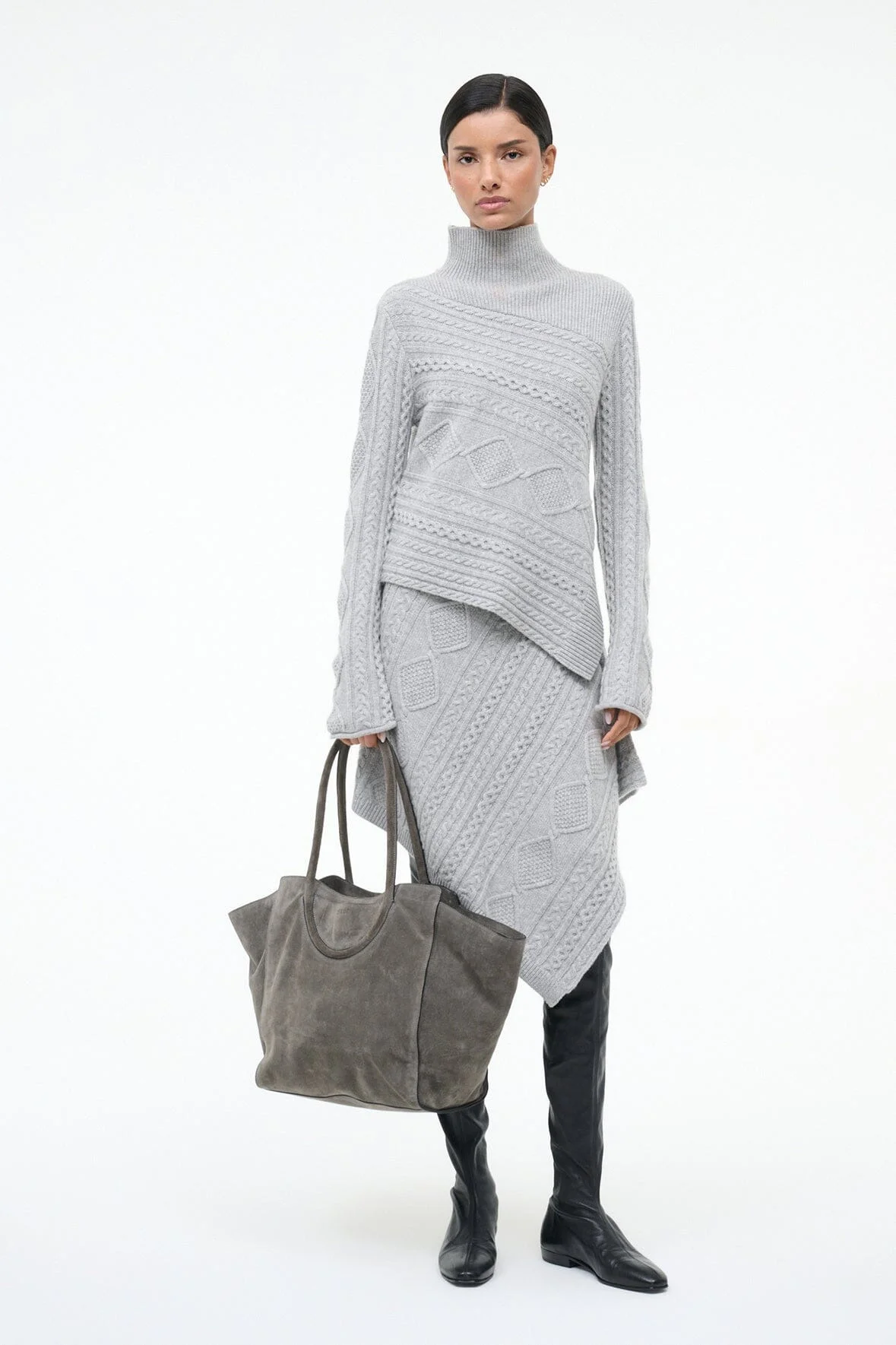 A cozy cable knit sweater skirt, the Veer Skirt feataures an asymmetrical hem, pull-on waistband, and can be worn as a set when paired with the matching Sidney Sweater. MORE DETAILS - 61% Ecoveero Viscose, 33% Metallic, 6% Nylon - Model is 5'10 and wearing a size S - Dry Clean Only