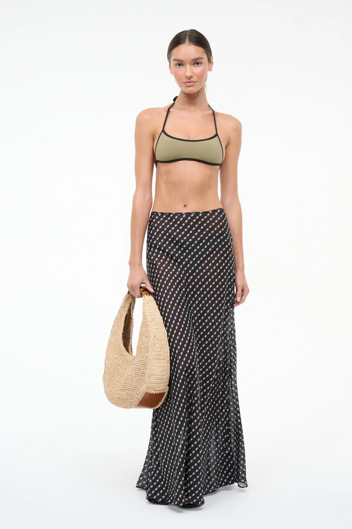 A printed chiffon maxi skirt featuring a black geometric pattern. This style is versatile enough to wear as a standalone piece or layer over swimwear for effortless beach-to-dinner transitions. The lightweight fabric drapes beautifully while maintaining its shape throughout the day. MORE DETAILS - 100% Silk - Model is 5'10 and wearing a size S - Dry Clean Only